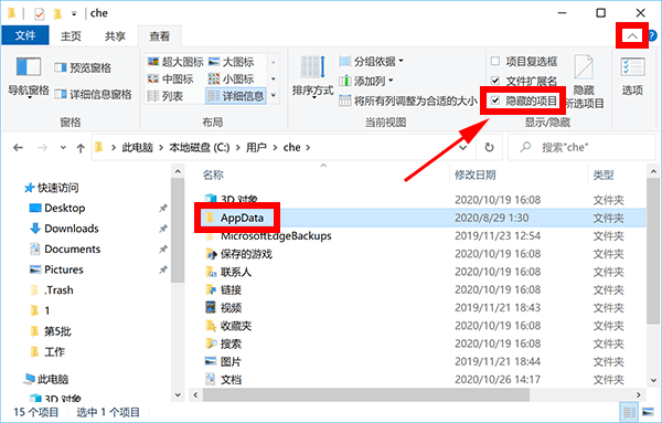 appdata文件夹在哪里 发布时间:2022-06-03 12:58:11 · 1552 阅读 · 0 评论 (本文内容测试环境:华硕灵耀14s电脑、Windows 10系统) 1、打开桌面上的此电脑,依次进入“C盘-用户-用户名”目录。 2、点击界面右上角的小箭头,在功能栏里,勾选“隐藏的项目”。 3、设置完成后,你就可以在该目录下,找到AppData文件夹。 需要注意的是,很多人找不到AppData文件夹,原因是没有开启系统隐藏文件显示。 另外,不同电脑,用户名是不一样的。大家进入用户文件夹后,需按具体用户名选择。 比如,在上图中,电脑用户名是che,你就需要进入“C盘-用户-che”文件夹目录。