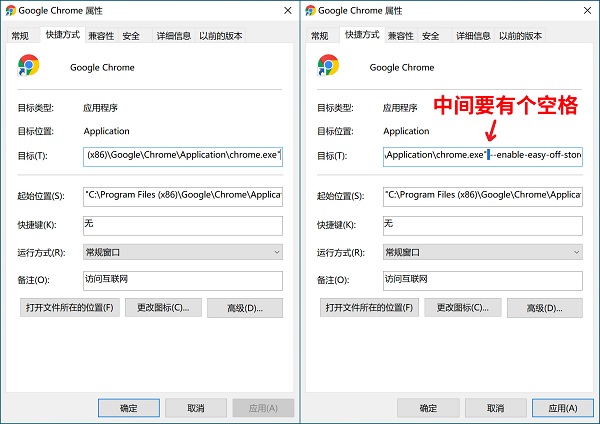 2、在目标一栏最后,添加以下参数。注意,参数之前要有一个空格。