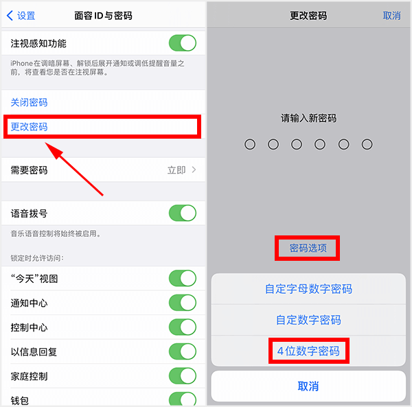 ios14设置4位数密码 发布时间:2022-06-03 13:00:52 · 1335 阅读 · 0 评论 (本文内容测试环境:iPhone 12手机、iOS 14系统) 1、打开iPhone的设置,进入“面容ID与密码”,输入锁屏密码。 2、选择“更改密码”,再次输入锁屏密码,点击“密码选项”。 3、切换到“4位数字密码”选项,即可输入你要设置的新密码。 设置完成后,用户可以按电源键重新亮屏,你会发现,锁屏密码已经变成4位数的了。 注意,iPhone默认推荐设置的是6位数密码,大家需要自行切换,才能更改为4位密码。 除了4位或6位数字,用户还可以设置字母,甚至是数字、字母组合内容,为锁屏密码。