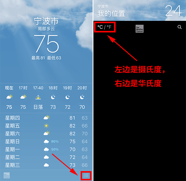 iPhone自带的天气应用,显示80度的原因是,用户不小心把度数单位切换成了华氏度。