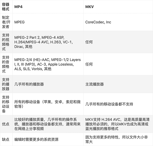 以下是MKV和MP4的详细列表对比,大家可以用来参考。