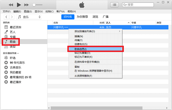 1、打开电脑上安装好的iTunes,点击左侧栏资料库里的“歌曲”项目,将准备好的歌曲文件拖进右侧的列表。