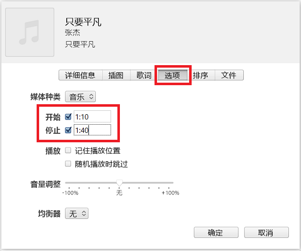 3、勾选“开始”和“停止”,填写要剪辑片段的秒数位置,时长需控制在40秒以内。由于iTunes没有试听预览功能,用户可以在其他音乐播放器上试听,明确秒数位置后,再填写进去。填写完,就可以点“确定”进行剪辑。