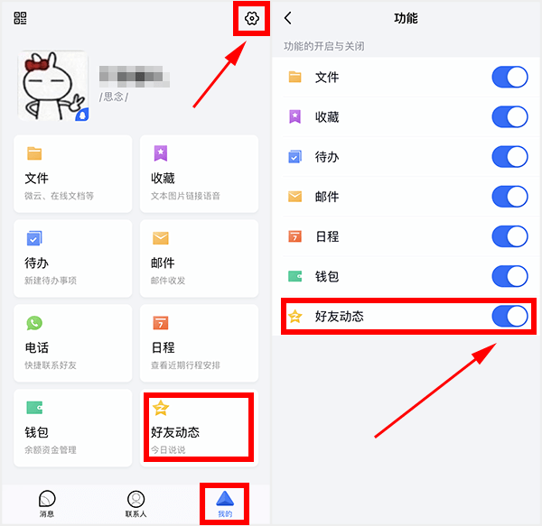 除了好友动态,大家还可以根据自己的需求,打开或关闭文件、收藏、邮件、日程等选项。