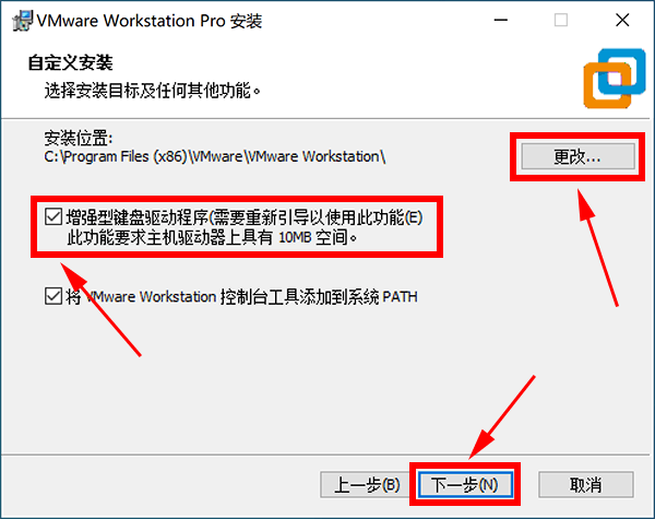 3、用户可以按需修改软件安装位置,勾选“增强型键盘驱动程序”,点击下一步。