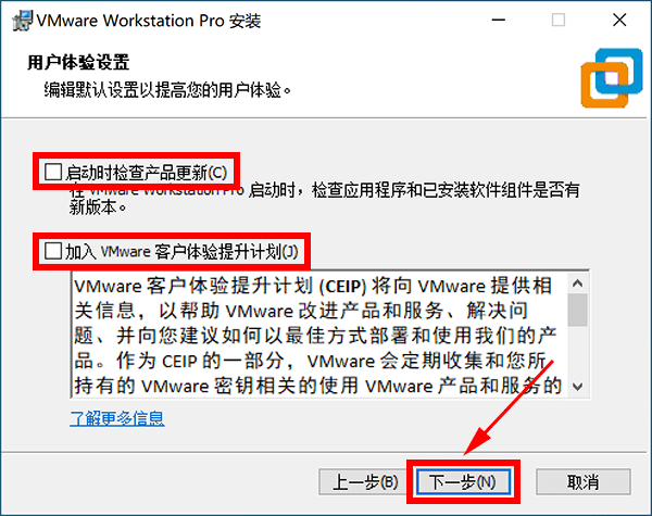 4、取消勾选“启动时检查产品更新”和“加入客户体验提升计划”,再点下一步。
