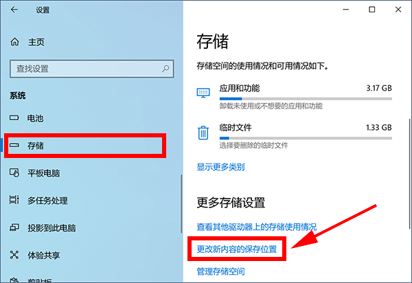 2、进入“系统”,在左侧栏选择“存储”,再点“更改新内容的保存位置”。