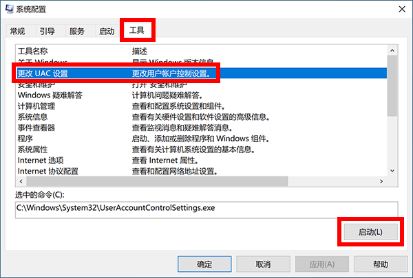 3、切换到“工具”选项卡,选中“更改UAC设置”,点启动。