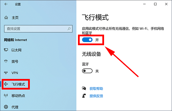 win10飞行模式怎么关掉 发布时间:2022-06-03 13:00:46 · 1318 阅读 · 0 评论 (本文内容测试环境:华硕灵耀14s电脑、Windows 10系统) 1、打开win10界面左下角开始菜单,点击“设置”按钮。 2、进入“网络和Internet”,在左侧栏点击“飞行模式”。 3、把正处于开启状态的飞行模式开关,切换到关闭即可, 需要注意的是,如果电脑打开了飞行模式,Wi-Fi、GPS、蓝牙等服务将会被禁用。 大家可以通过任务栏右下角图标,来判断飞行模式是否开启,开启时它是一个小飞机。 另外,用户还可以点击任务栏右下角通知图标,找到快速关闭win10飞行模式的按钮。