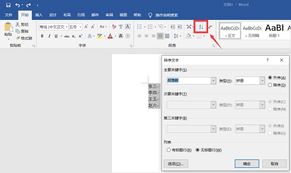 word排序在哪 发布时间:2022-06-03 12:59:27 · 1883 阅读 · 0 评论 1、打开Word文档,选中要排序的内容。 2、在菜单栏切换到“开始”选项卡,找到有AZ字样的排序按钮。 3、打开排序功能后,可以根据需求设置排序方式,最后点确定就行了。 排序按钮的功能位置如上图所示,找不到的用户,可以参考下。 排列类型分为笔划、拼音、数字、日期。同时,你也可以设置升序排列,或者降序排列。