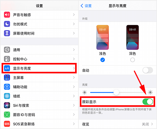 原彩显示在哪里设置 发布时间:2022-06-03 12:58:12 · 1332 阅读 · 0 评论 (本文内容测试环境:iPhone 12手机、iOS 14系统) 1、打开iPhone的设置,页面往下拉,找到“显示与亮度”。 2、点击进入“显示与亮度”,里面有一个“原彩显示”开关。 3、用户可以根据自己的需求,选择开启或关闭原彩显示。 原彩显示功能,会根据环境光线变化,自动调整屏幕色彩,让显示屏颜色更接近现实色调。 比如,当环境色温过冷时,手机会调成偏白色温。当环境色温过暖时,则会调成偏黄色温。 开启原彩显示后,手机屏幕会有点偏黄,其原因是大家平时所处的环境,色温都比较暖。